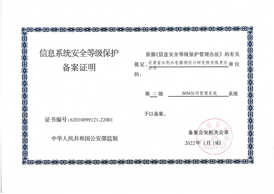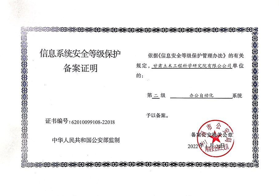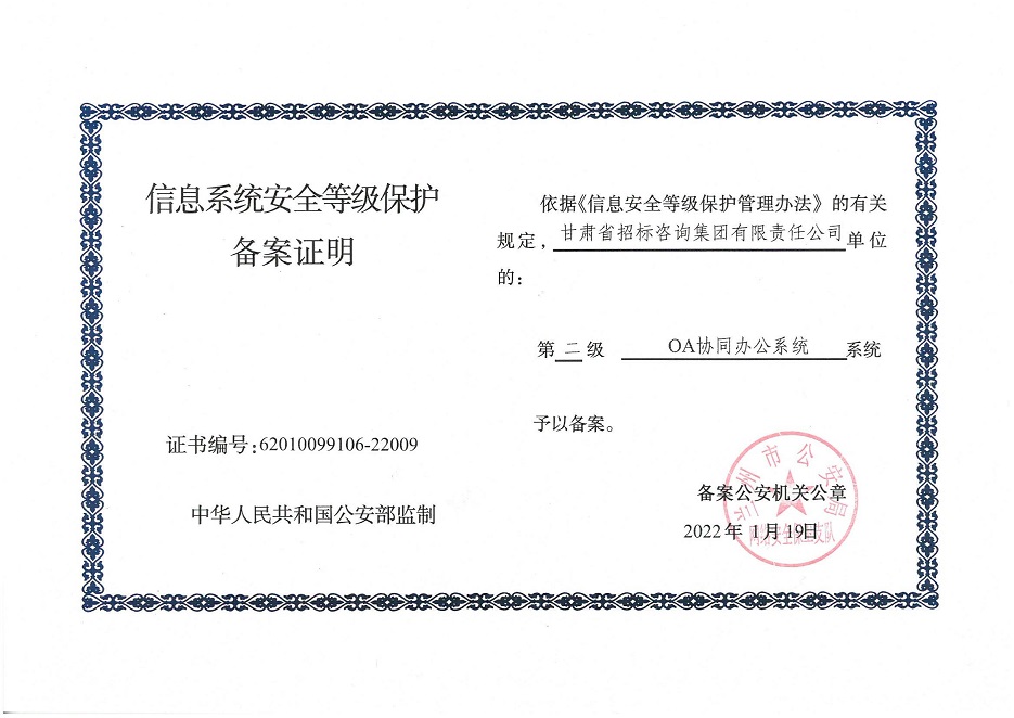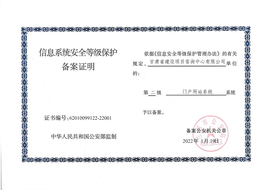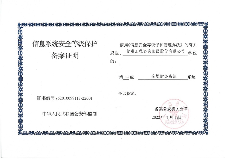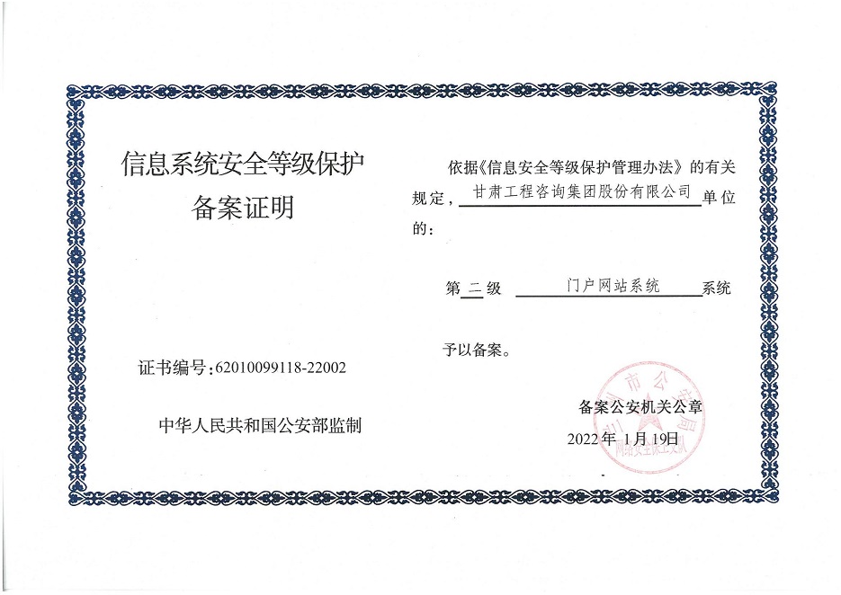 甘肃工程咨询集团股份公司信息系统通过安全等级保护2.0备案认证