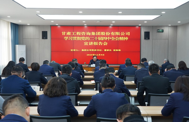 12月9日,甘肃工程咨询集团召开学习贯彻党的二十届四中全会精神宣讲报告会。集团公司党委书记、董事长张佩峰作专题宣讲报告,围绕全会重大意义、核心要义及“十四五”发展成就、“十五五”时期目标任务等进行了系统阐释,并结合集团实际提出贯彻落实的思路举措。