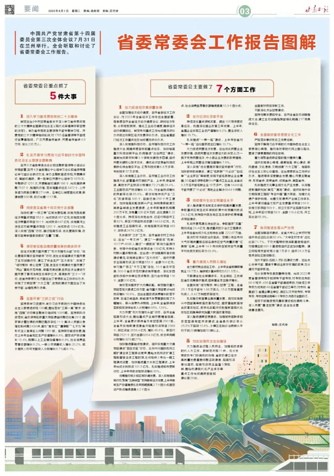 在经济发展方面开展了“引大引强引头部”行动、“优化营商环境攻坚突破年”行动,在社会和谐建设方面开展了主动创稳行动、建立了安全生产“五大体系”、实施了“结对帮扶·爱心甘肃”工程,在生态文明建设方面开展了“两山”基地示范市县、幸福河湖创建,在民主法治建设方面开展了黄河流域生态保护立法、港澳委员“三个一”行动,在宣传思想文化方面出台了思想政治工作评价办法、实施了文明甘肃“六大工程”,在党的建设方面出台了关爱干部、容错免责办法等。