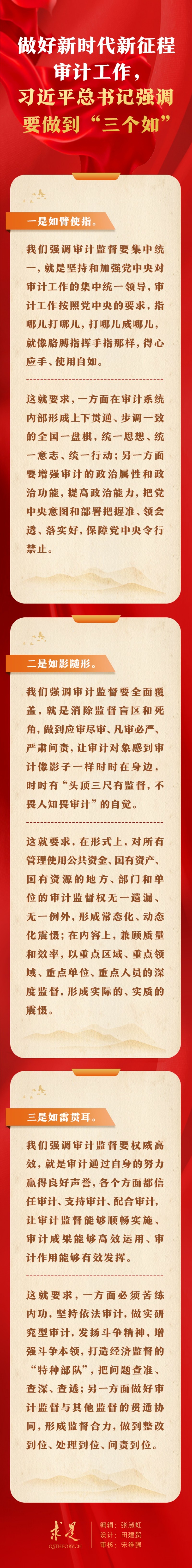 11月1日出版的第21期《求是》杂志刊发习近平总书记重要文章《在二十届中央审计委员会第一次会议上的讲话》。在这篇重要文章中,习近平总书记指出:“做好新时代新征程审计工作,总的要求是在构建集中统一、全面覆盖、权威高效的审计监督体系,更好发挥审计监督作用上聚焦发力,具体要做到‘三个如’。”