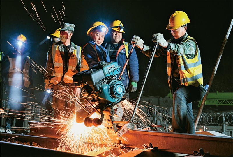 2024年4月10日,在内蒙古包头市,包银高铁引入包头枢纽工程的关键控制性工程之一——包西上行线路拨接完成施工。此次施工完成,标志着包银高铁引入包头枢纽包头站改造工程取得重大进展,为包银高铁开通奠定坚实基础。图为4月10日凌晨,工人在包西上行线路上作业。 新华社记者 刘磊/摄
