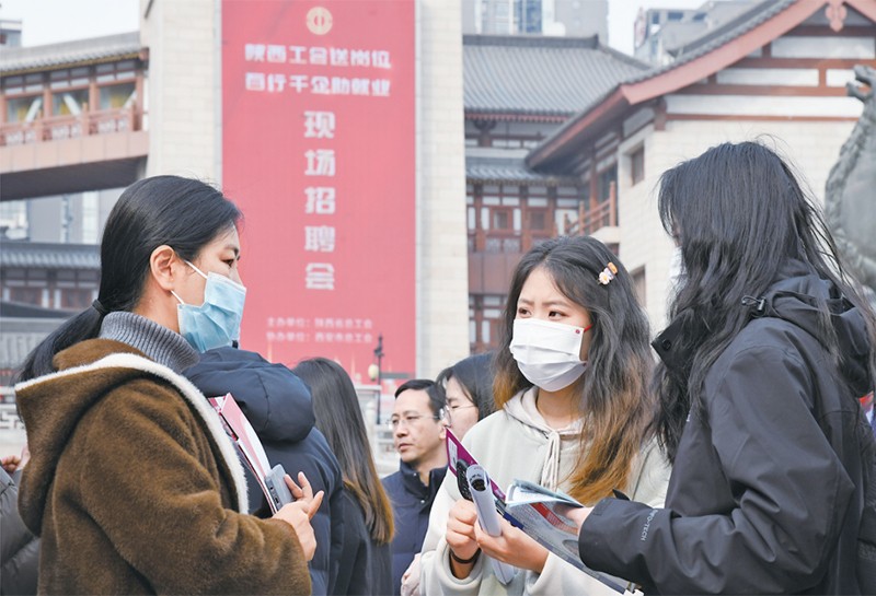 2024年3月6日,由陕西省总工会举办的2024年陕西工会“春送岗位”就业服务月启动仪式在西安举行。与启动仪式同期举办的现场招聘会吸引约200家用人单位参加,提供岗位超过5000个。图为当日求职者在现场招聘会上与企业工作人员交流。 新华社记者 张博文/摄