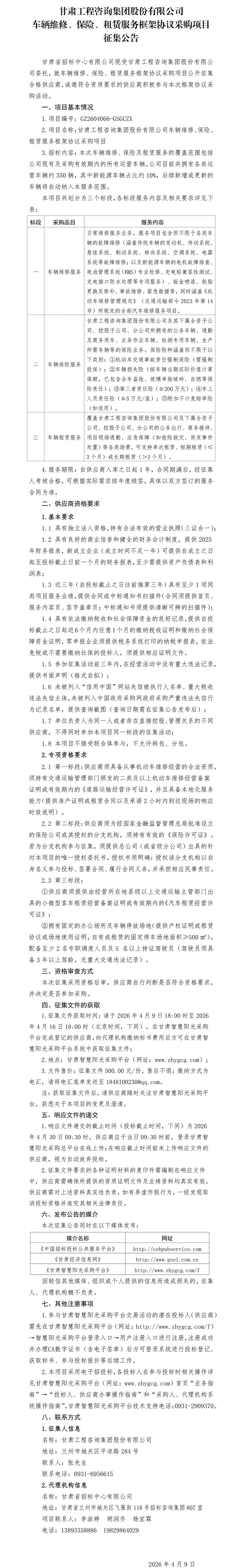 甘肃工程咨询集团股份有限公司车辆维修、保险、租赁服务框架协议采购项目征集公告
