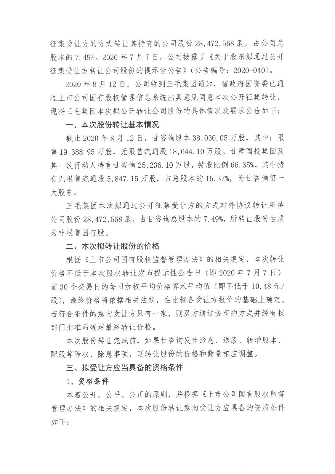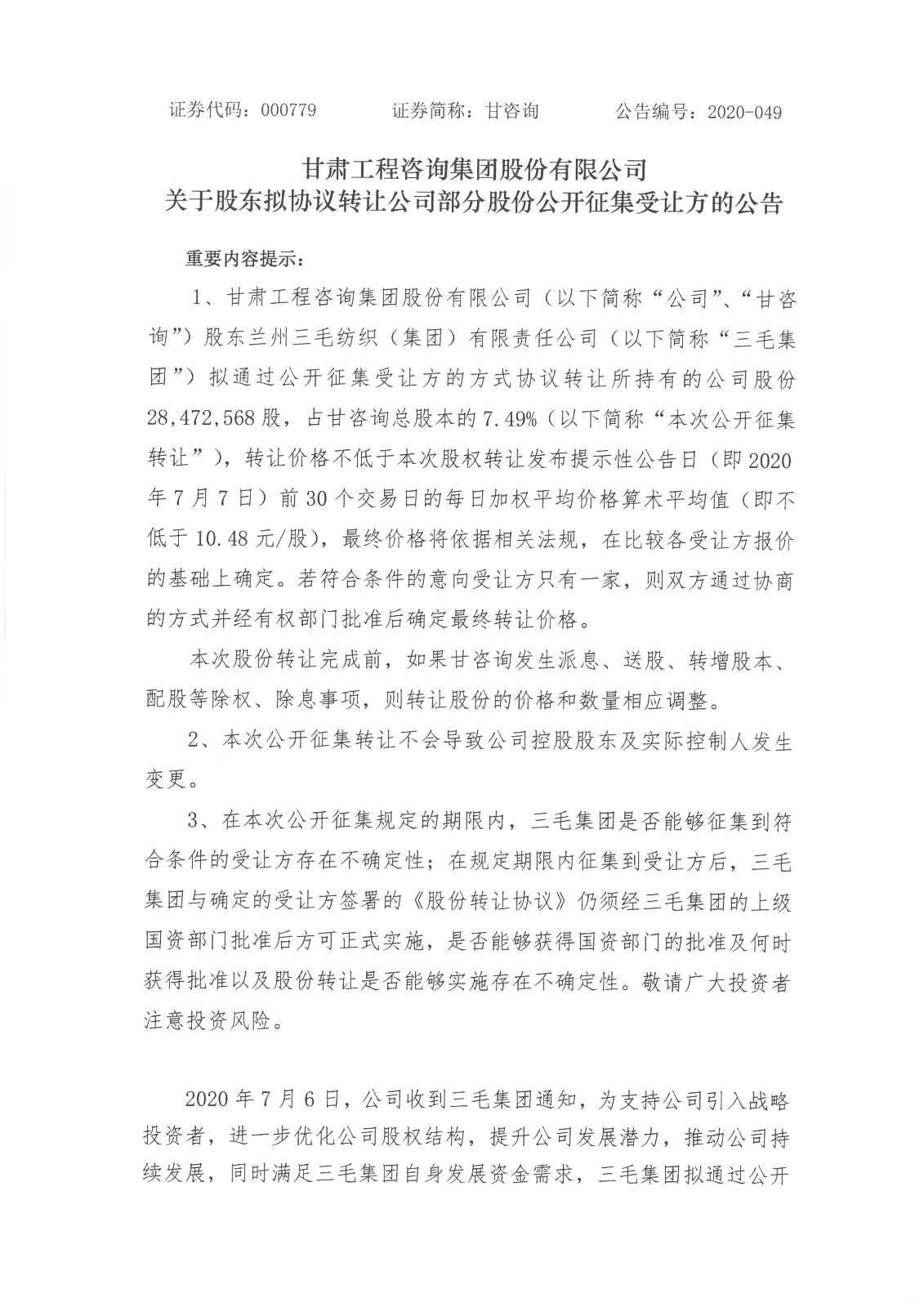关于股东拟协议转让公司部分股份公开征集受让方的公告