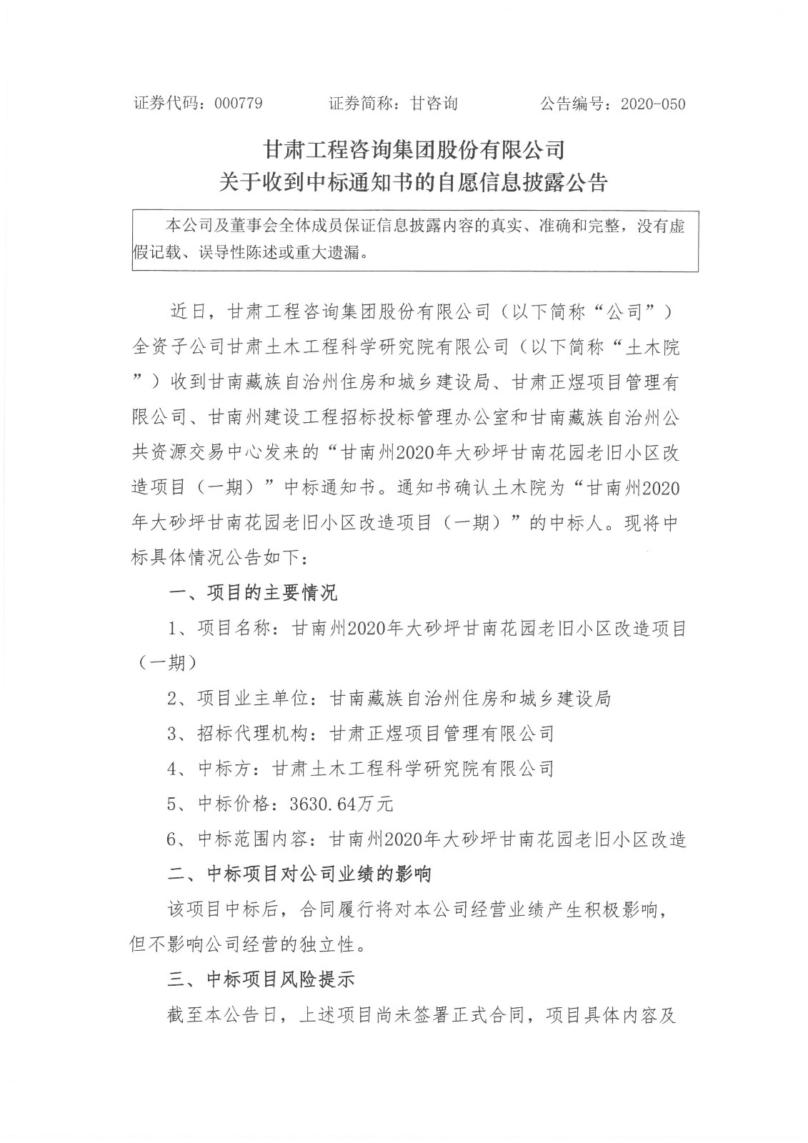 关于收到中标通知书的自愿信息披露公告
