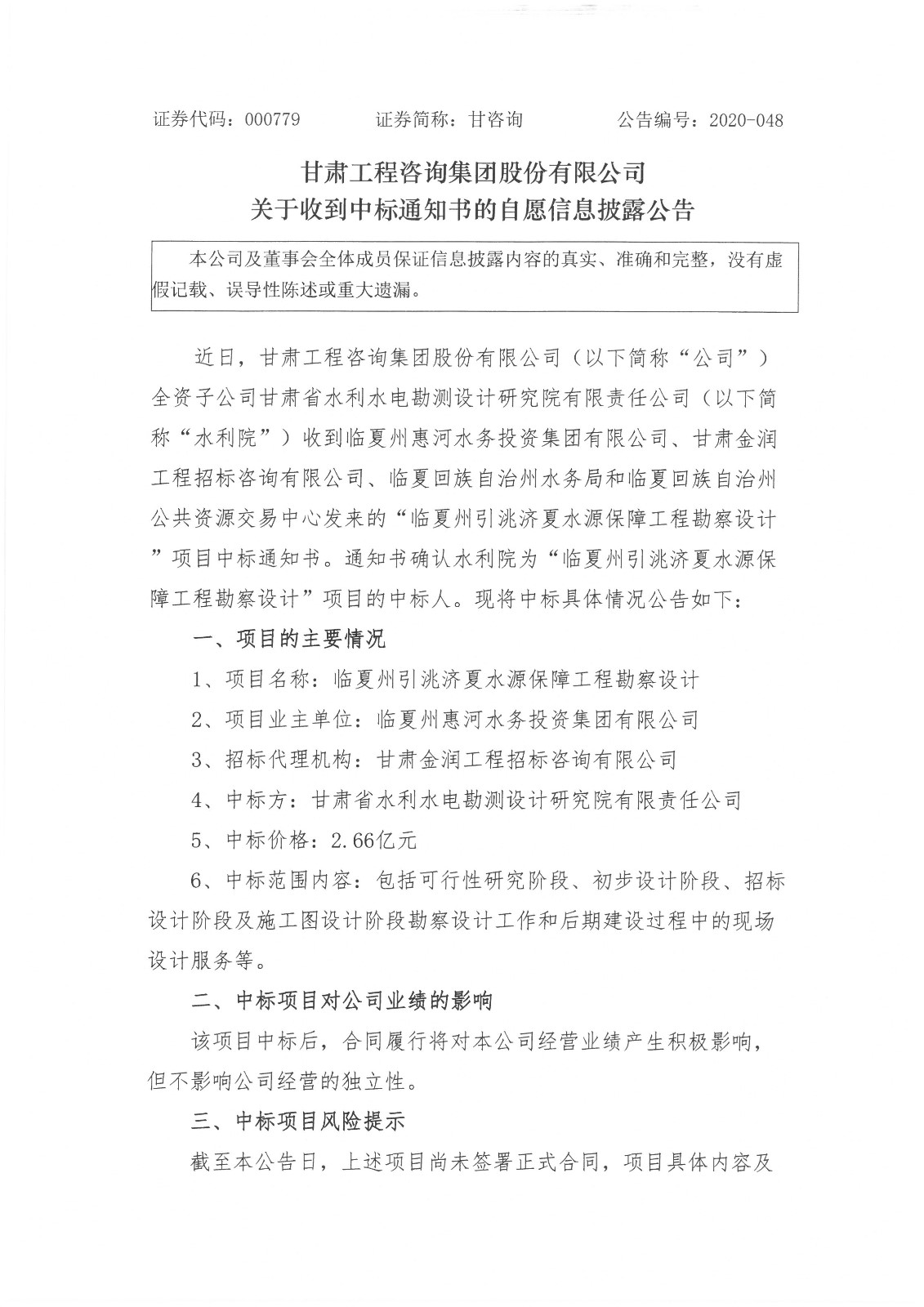 关于收到中标通知书的自愿信息披露公告